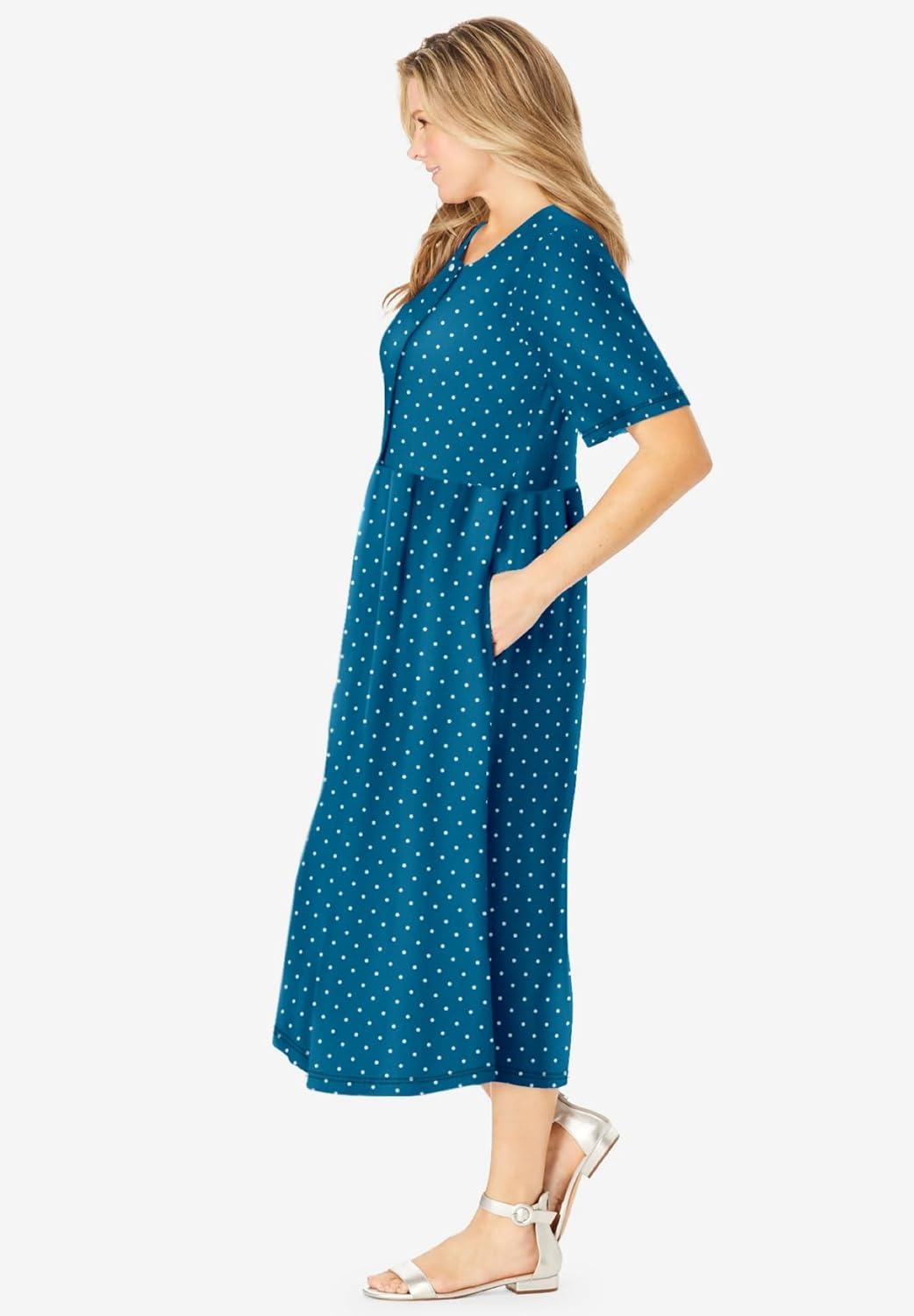 br>Experience ultimate comfort in this soft knit button-front dress. br> Elbow sleeves, relaxed style br> Flattering gathered waist complements every silhouette. br> Full skirt with a lovely sweep creates a feminine vibe. br> Side seam pockets add a practical touch for everyday essentials. br> Available in Regular (48″ length) and Petite (46″ length) options, both falling elegantly at mid-calf. br> Crafted from a breathable cotton/poly blend. br> Effortlessly maintains its charm with machine washable fabric. br> Pair with sandals, heels, sneakers, or flats for versatile styling. br> Imported