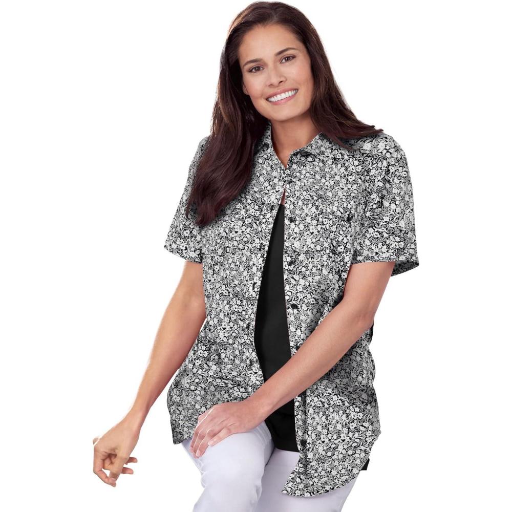 Woman Within Plus Size Short-Sleeve Cotton Campshirt(Black Paisley Ditsy)