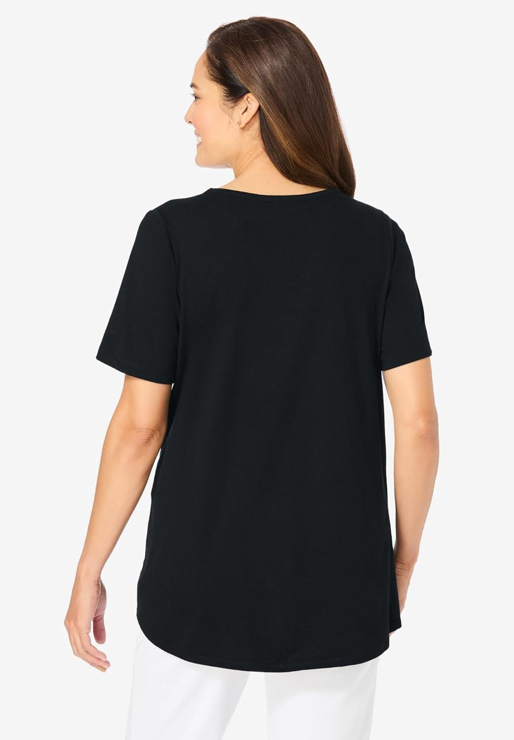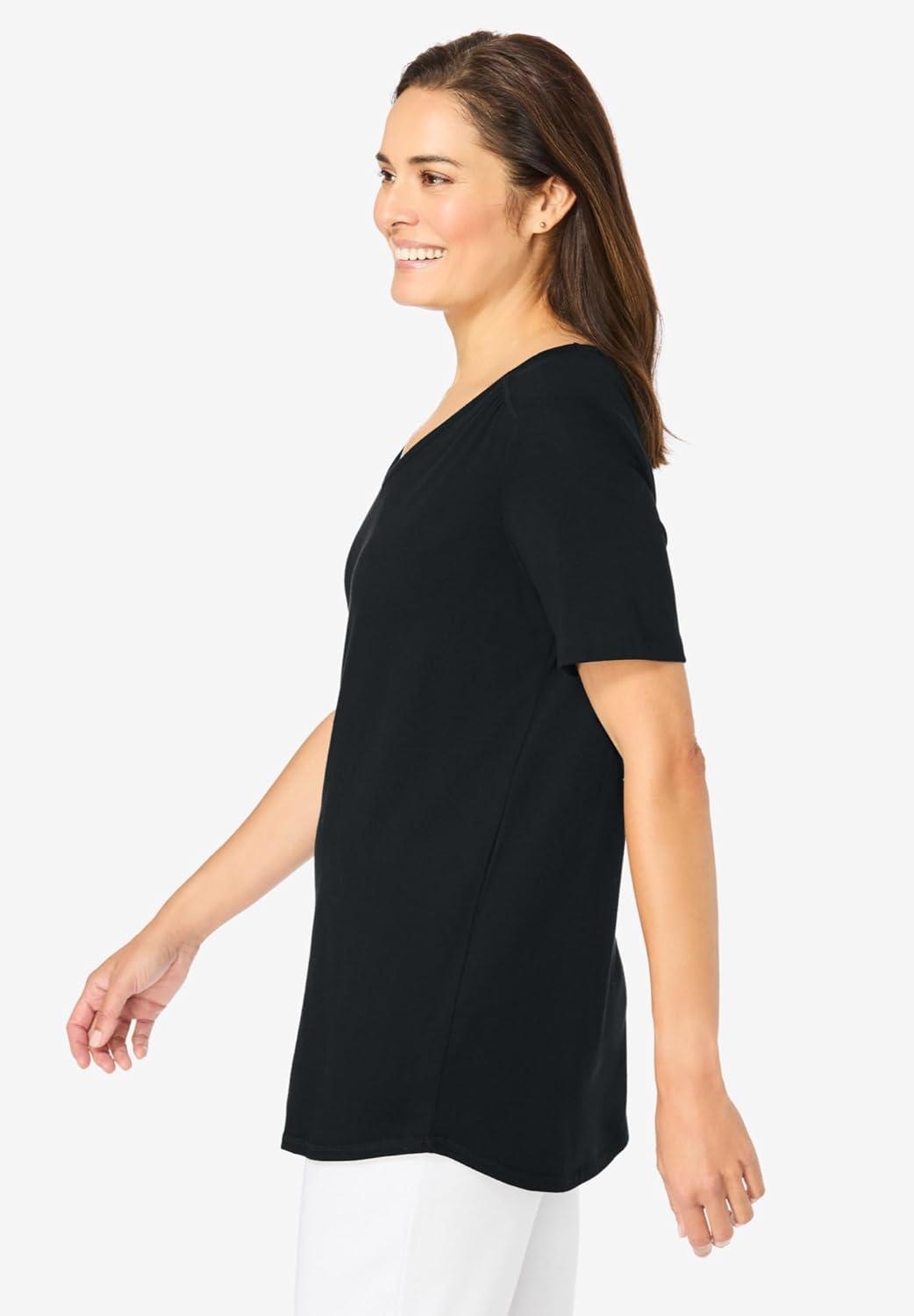 Woman Within Plus Size Short-Sleeve V-Neck Shirred Tee(Black)
