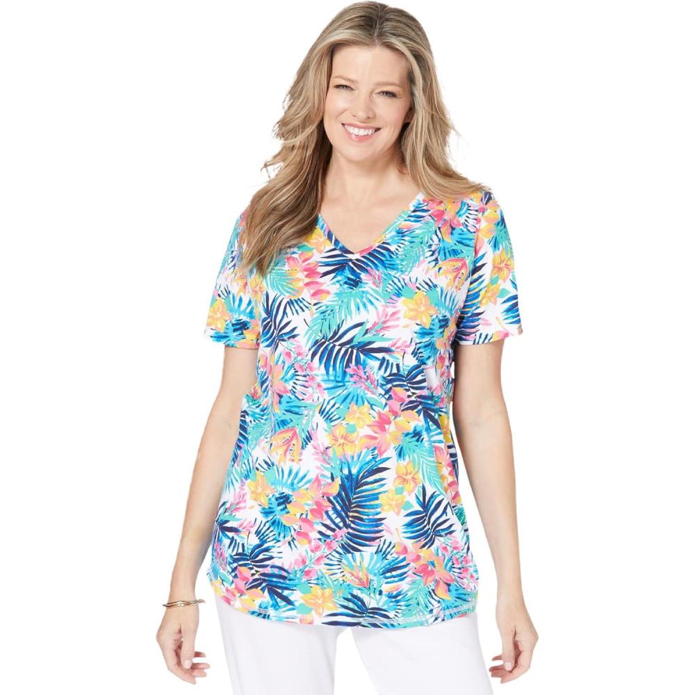 Woman Within Plus Size Short-Sleeve V-Neck Shirred Tee(White Multi Tropicana)