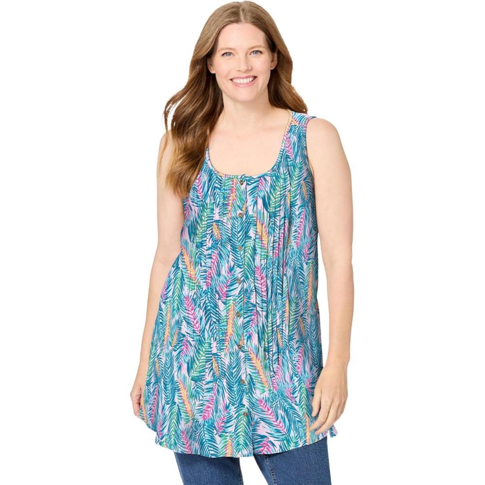 Woman Within Plus Size Sleeveless Pintuck Gauze Shirt(Pink Watercolor Palm)