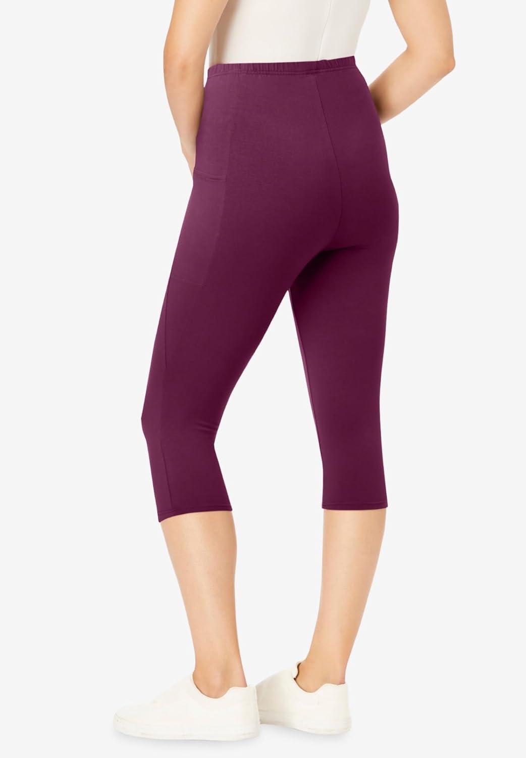 Woman Within Plus Size Stretch-Cotton Knit Pull-On Pocket Capri Leggings(Deep Claret)