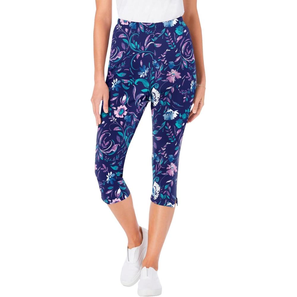 Woman Within Plus Size Stretch-Cotton Knit Pull-On Printed Capri Leggings(Navy Multi Florals)