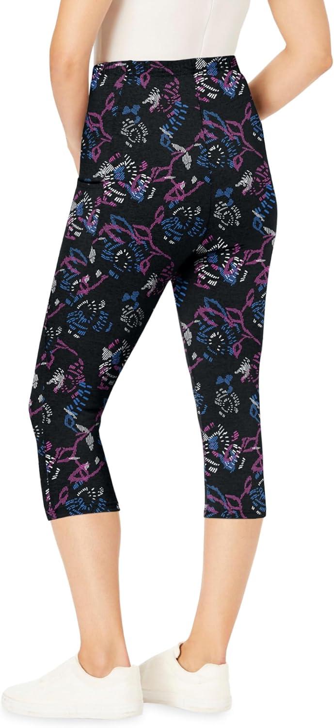 Woman Within Plus Size Stretch-Cotton Knit Pull-On Printed Pocket Capri Leggings(Black Abstract Floral)
