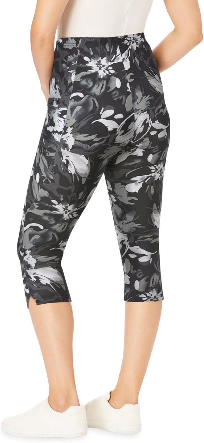 Woman Within Plus Size Stretch-Cotton Knit Pull-On Printed Pocket Capri Leggings(Black Splash Floral)