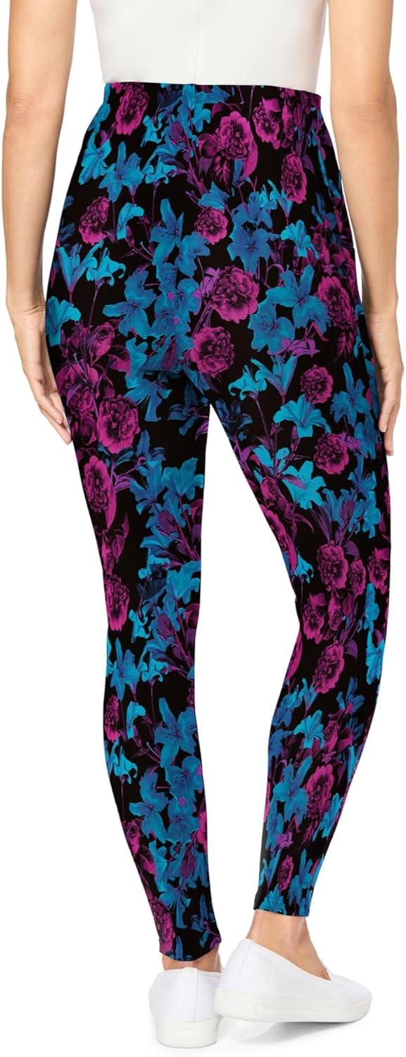 Woman Within Plus Size Stretch-Cotton Knit Pull-On Printed Pocket Leggings(Black Teal Lilies)