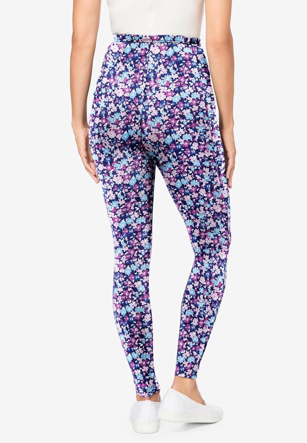 Woman Within Plus Size Stretch-Cotton Knit Pull-On Printed Pocket Leggings(Navy Happy Ditsy)