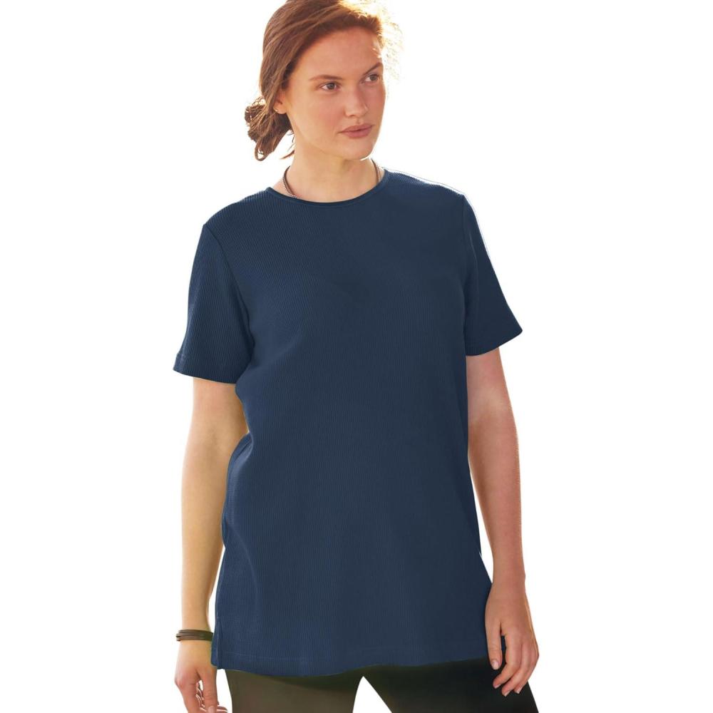 Our best-selling waffle-knit thermal top featuring a shiny satin crewneck. br> Enjoy all-day comfort with soft and breathable cotton/poly fabric. br> Flattering 28-inch length offers modest coverage and a relaxed fit. br> Available in a beautiful range of colors to match any wardrobe. br> Perfect for any season, making it a versatile addition to your closet. br> Easy care – simply machine wash to keep it looking fresh. br> Imported
