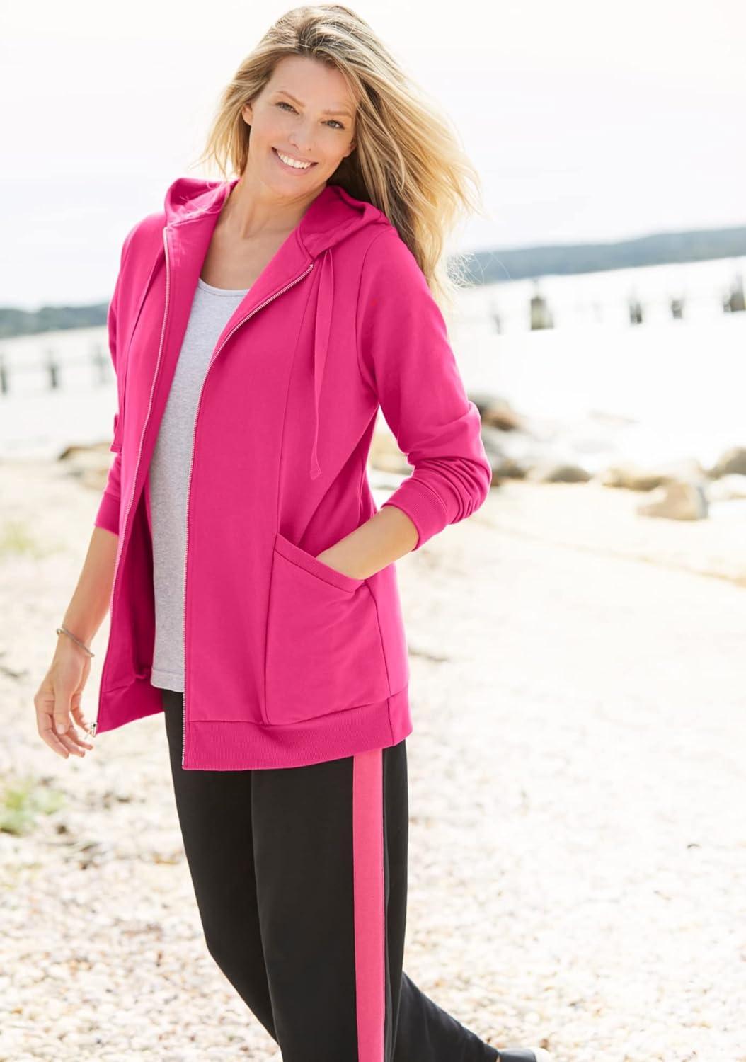 Experience ultimate comfort with the baby French terry fabric that keeps away moisture and keeps you fresh all day. br> Enjoy the versatile look with the classic hoodie style and longer tunic length that rests over your hips for the perfect fit. br> Stay warm and cozy with the drawstring hood and zippered front, allowing you to adjust your comfort level easily. br> Add a sporty touch to your outfit with the rib knit hem and cuffs, providing an athletic edge. br> Keep your essentials close at hand with the convenient front pockets. br> Long 30″ tunic length hits at the upper thigh for a flattering silhouette. br> Made from a durable cotton/poly blend for long-lasting wear. br> Machine washable for easy care and maintenance. br> Complete your look with our . br> Imported